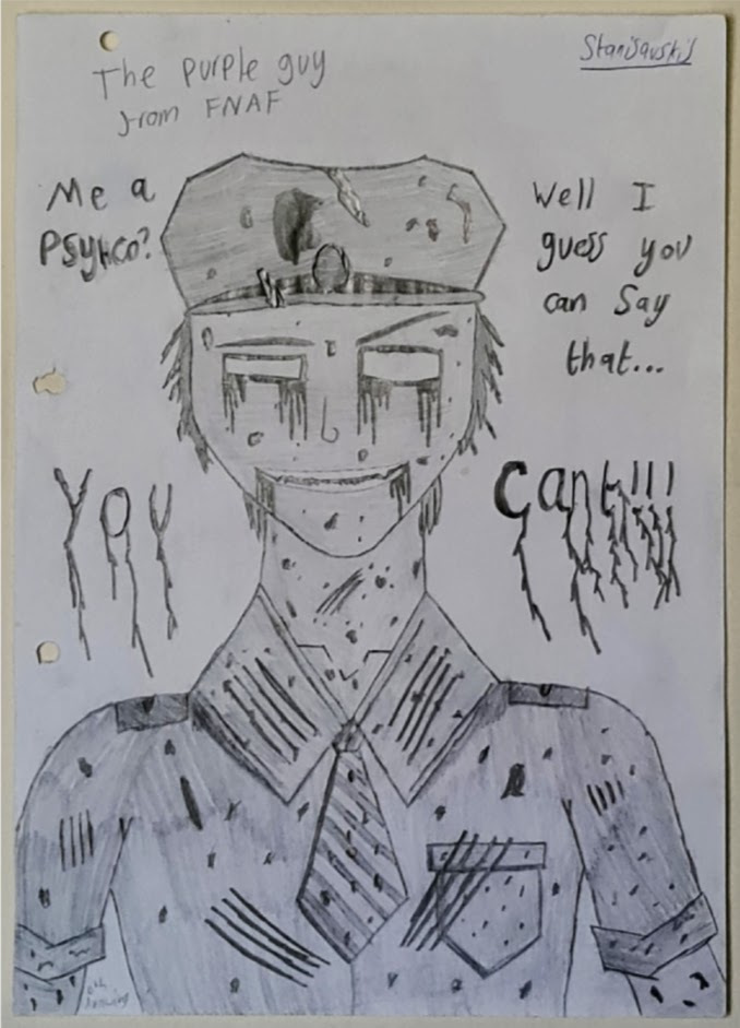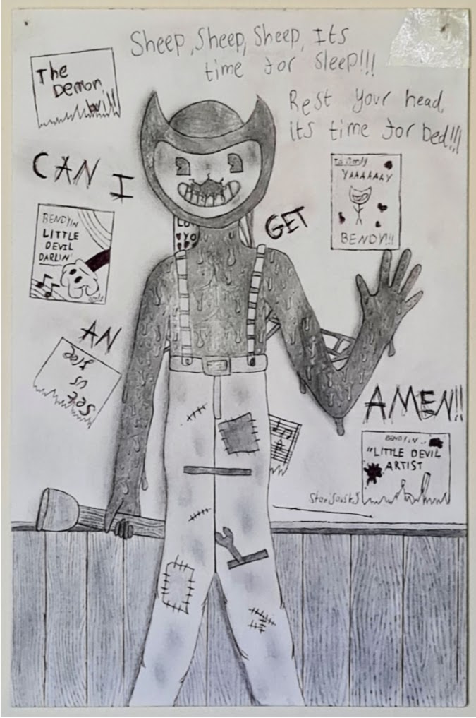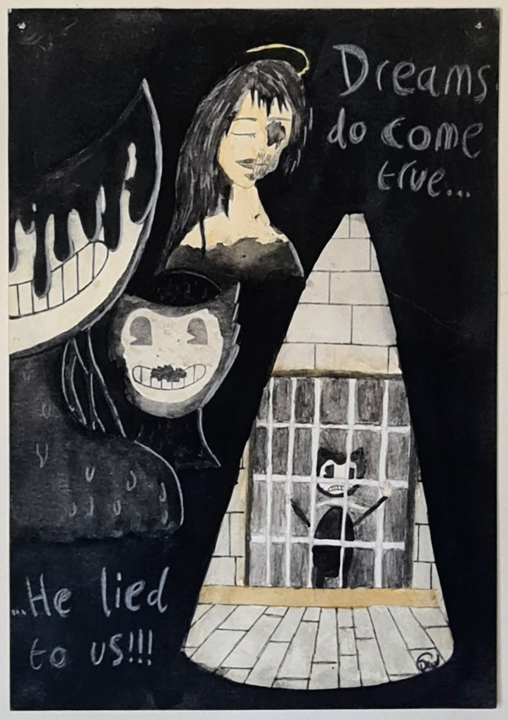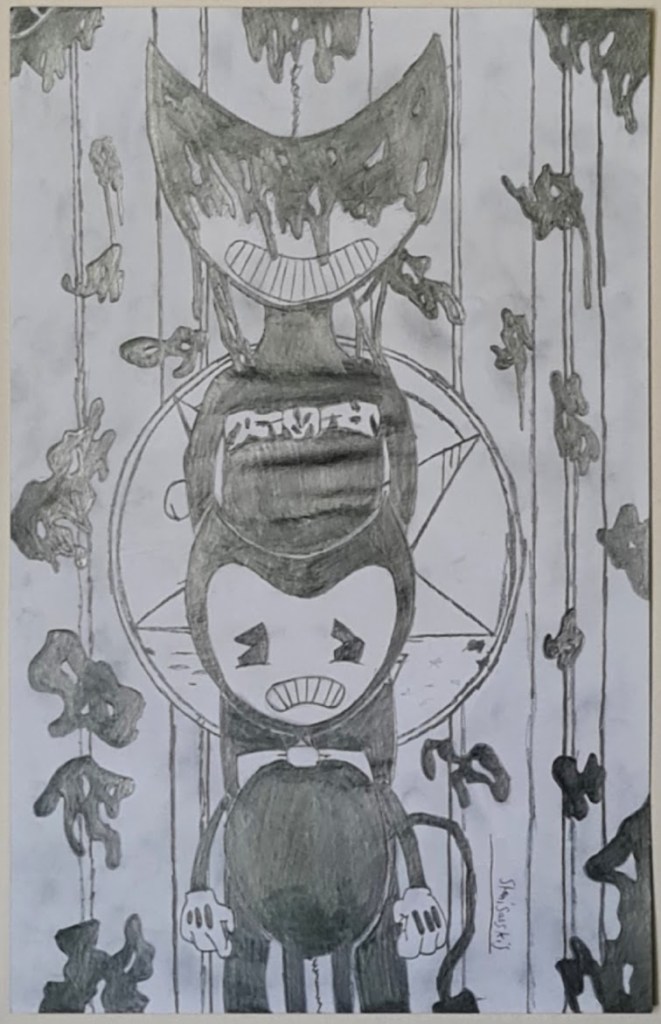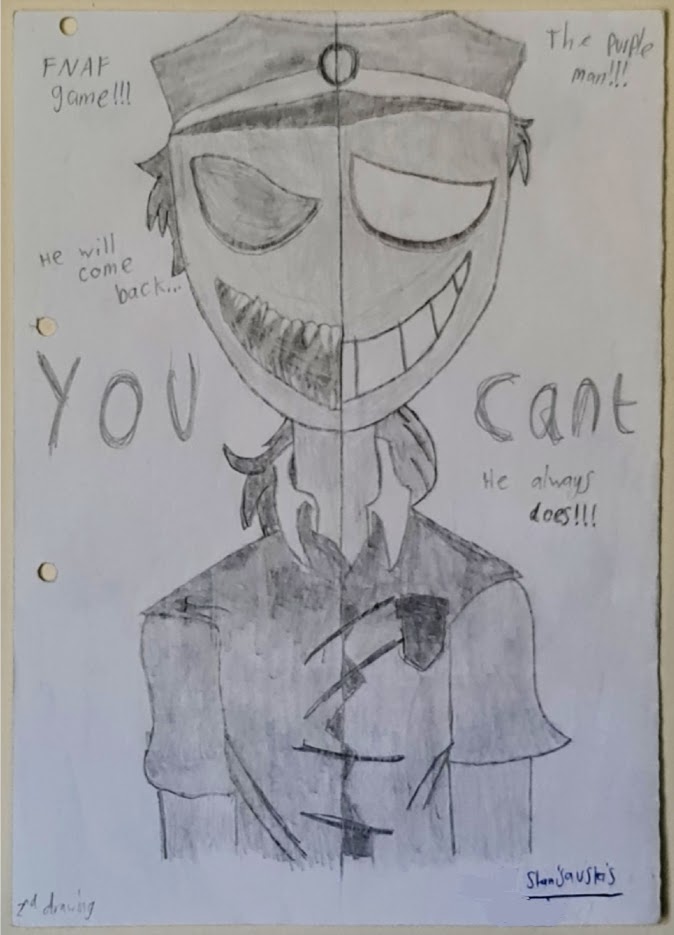 But back to the art itself, as you will see, I followed many different fan bases, to which I would make fan art of, or even my own OC’s (original characters) Themselves, some of the fan bases I was interested in at the time where; Five Nights at Freddy’s, Bendy and the Ink Machine, various types of anime and creepy pasta. This really helped me express my thoughts back then, and I would later start to use art as a sort of therapy, which would later lead me down the path of emotion and mental health expression you would see in my art today.